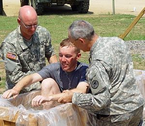 1st Lt. Bryan T. Wright, 478th Engineer Battalion (left), and Maj. Quentin Collins, 1203rd Engineer Battalion (right) baptize Staff Sgt. Edward A. Lewis, 224th Engineer Company, in a handmade, field baptismal font at Forward Operating Base Liberty. “Freedom of religion; if you honor that, you honor everything the Soldiers stand for,” said Chap. (1st Lt.) Bryan T. Wright, with the 478th Engineer Battalion. “Take that away, and you take away everything a Soldier stands for and puts their life on the line for.”